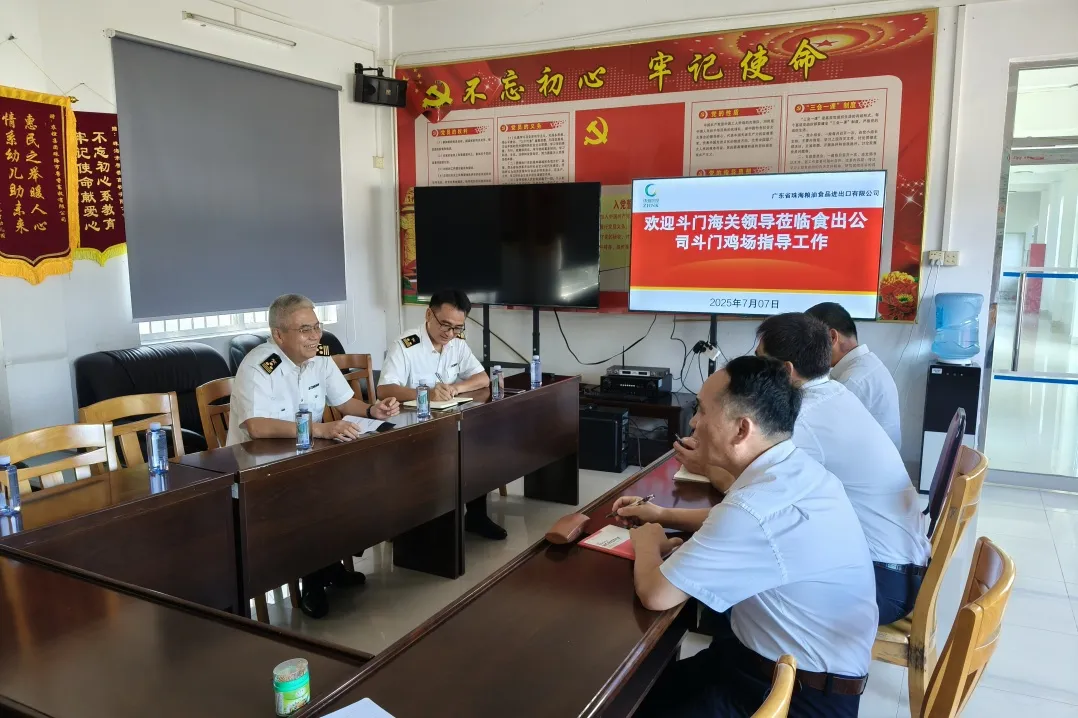 7月7日,斗门海关副关长丁来涛一行到访珠海农控集团下属食出公司斗门鸡场,与企业管理团队座谈交流。