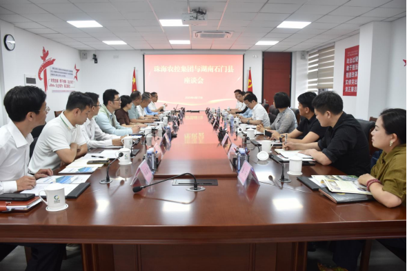4月17日,湖南石门县县委书记吴兴国一行到珠海农控集团参观座谈。会前,珠海农控集团党委书记、董事长李鸿斌会见了吴兴国县委书记一行,并就农产品资源流通、市场联动发展、区域品牌共建等交换了意见,集团党委副书记、总经理冯能斌出席座谈会。