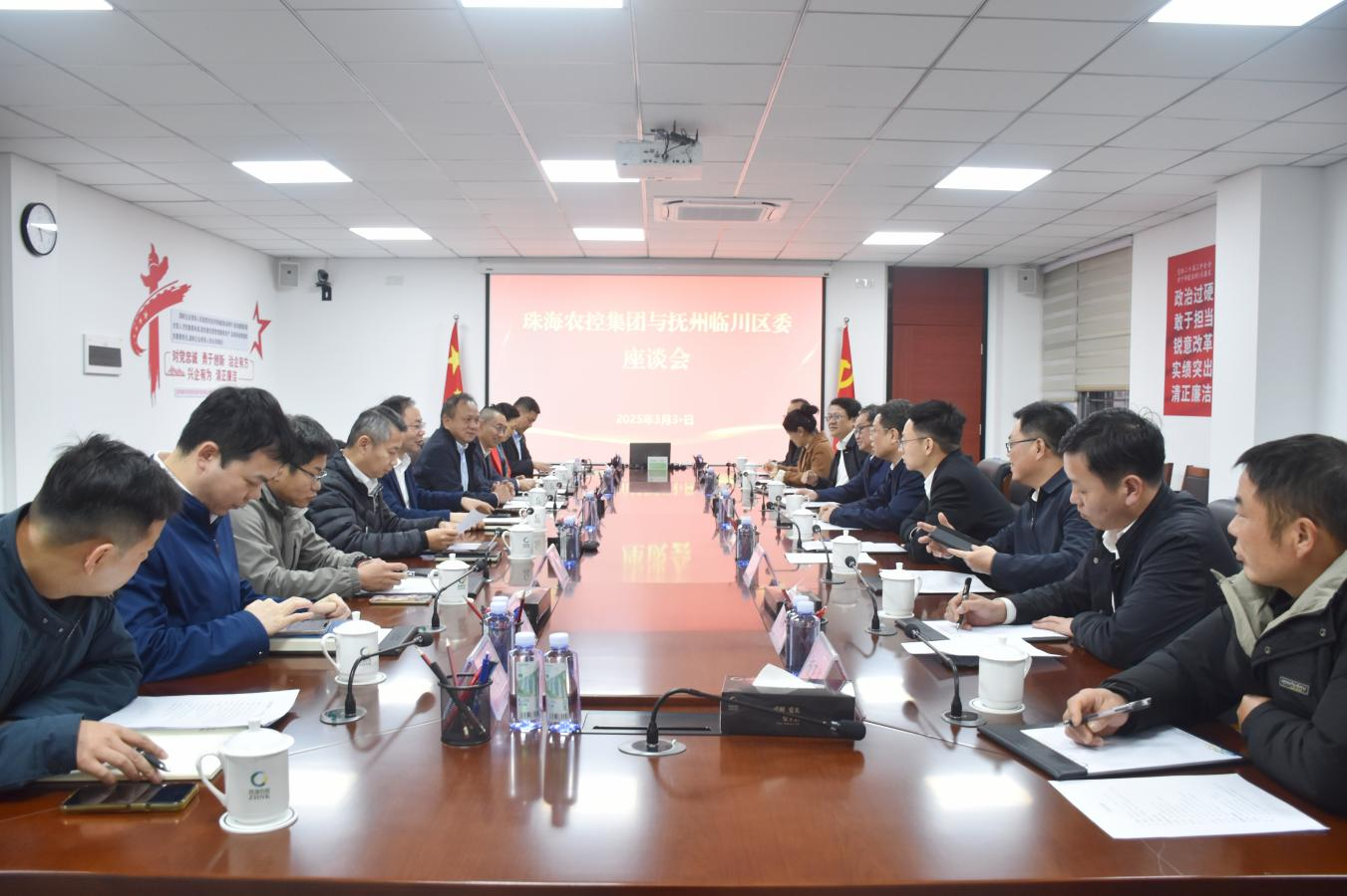 3月31日,江西抚州临川区区委副书记、区长李群彪一行到珠海农控集团就供港澳农产品供应链建设进行座谈交流。珠海农控集团党委书记、董事长李鸿斌出席座谈会,党委副书记、总经理冯能斌主持会议。