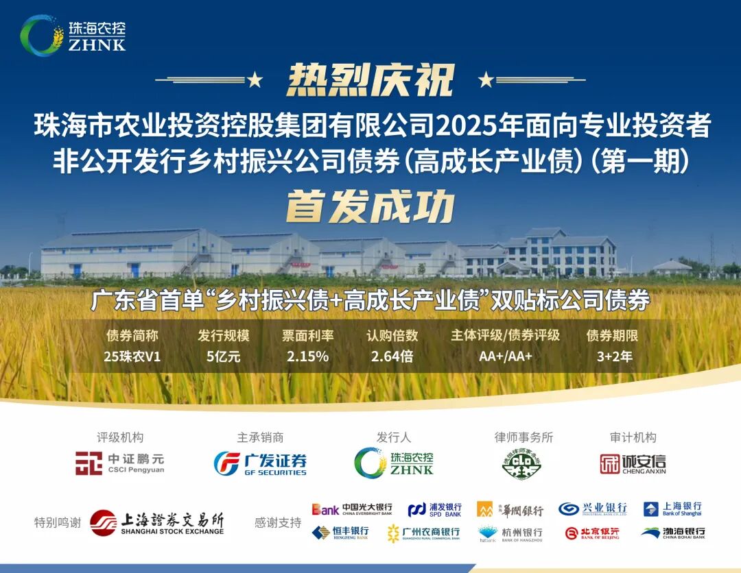 9月25日,网上现金买球(中国)有限公司官网(以下简称“珠海农控集团”)2025年面向专业投资者非公开发行乡村振兴公司债券(高成长产业债)(第一期)在上海证券交易所成功发行,本期债券发行规模5亿元,期限为3+2年,票面利率2.15%,创全国同评级、同期限乡村振兴私募公司债历史新低。