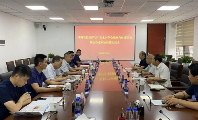 为贯彻落实市委、市政府工作部署,2023年6月9日,珠海农控集团下属珠海市农控海洋产业发展有限公司(简称“农控海洋公司”)与广东水产学会举行战略合作座谈会暨合作意向协议签约仪式。珠海农控集团副总经理钟华、广东水产学会党支部书记吴灶和、理事长林蠡、秘书长陈健光、秘书刘忠辉参加会议。农控海洋公司副总经理吴文中主持会议。