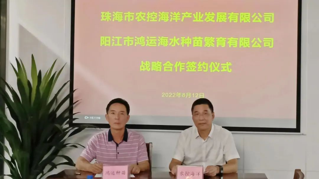 为进一步推进珠海农控智慧海洋牧场综合产业项目建设工作,2022年8月12日,农控海洋公司与阳江市鸿运海水种苗繁育有限公司(以下简称“阳江鸿运公司”)在珠海农控集团会议室举行战略合作签约仪式。双方代表签订了战略合作协议。